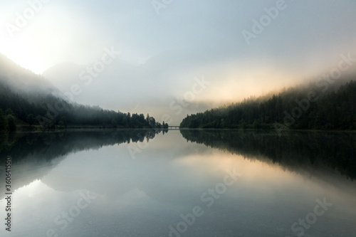 Fototapeta premium Nebliger Plansee in Tirol zum Sonnenaufgang