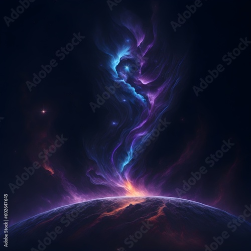 © 0kayish, Obraz premium Nebula full of stars viewed from a planet during sunrise. Generative AI.