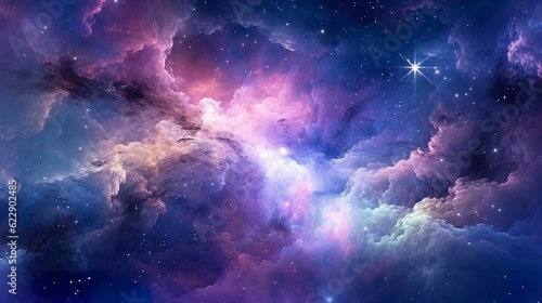 © MstAsma, Fototapeta premium Nebula Galaxy Background With Purple Blue Outer Space. Cosmos Clouds And Beautiful Universe Night Stars. AI Generative