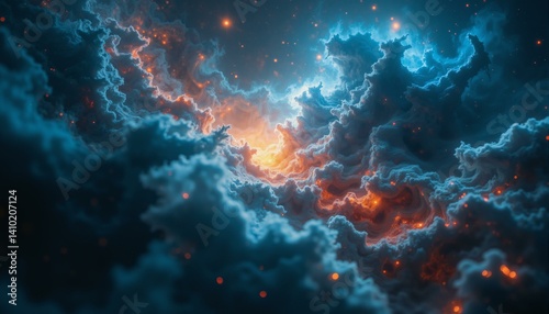 Fototapeta premium Nebula swirls display indigo, cerulean, crimson, and gold hues; cosmic dust...
