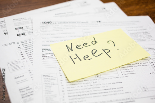 © Julia, Obraz premium Need help text on sticker with blank 1040 tax return U.S. IRS form. Tax season.