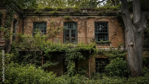 © AkuAku, Fototapeta premium Neglected balcony of a derelict mansion, erosion risk