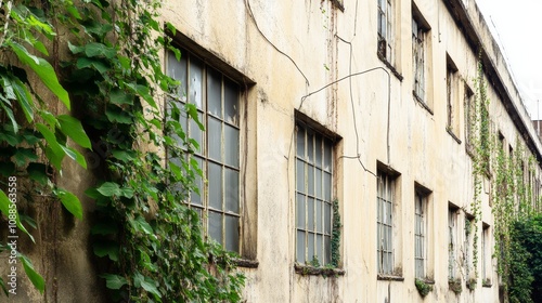 Fototapeta premium Neglected Industrial Structure Overgrown with Ivy, Serene Blue and Green...