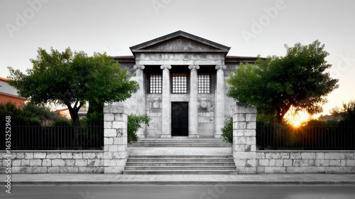 Obraz premium Neo classical building with symmetrical columns a central doorway and stone steps flanked by trees and a stone wall