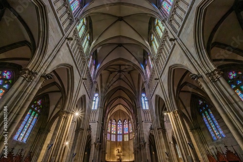 © ikuday, Fototapeta premium Neo-Gothic Cathedral Interior with Vaulted Ceilings and Stained Glass Windows, Good Shepherd (Buen Pastor)