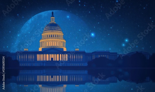 © smartcat, Obraz premium Neoclassical Capitol Building Illustration with Starry Sky and Blue Minimalist Design