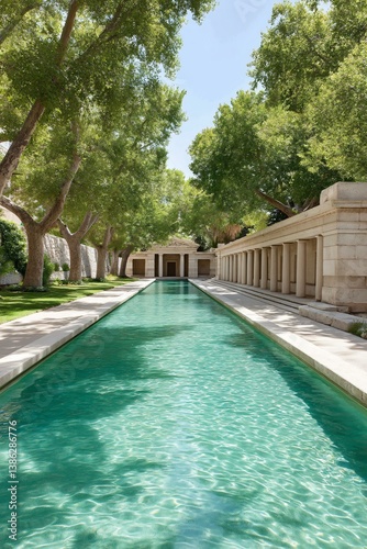 Fototapeta premium Neoclassical Mediterranean pool with stone-carved statues, column-lined...
