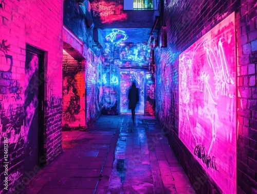 Fototapeta premium Neon alleyway, person walking, graffiti art, night, urban exploration,...