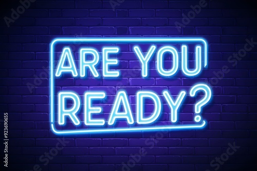 Obraz premium Neon ARE YOU READY? sign with blue neon outline against dark brick wall.