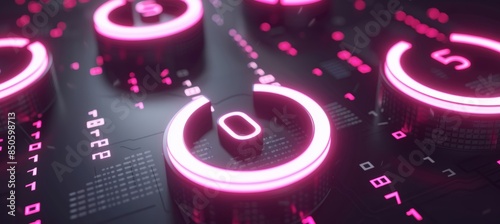 Fototapeta premium Neon binary code grid with swirling abstract shapes for visually striking digital display