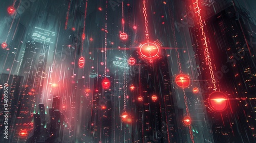 Obraz premium Neon binary code rains on a dark cityscape glowing red warning symbols float...