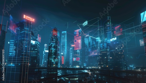 Naklejka premium Neon blue and holographic designs dominate this night cityscape, casting a...