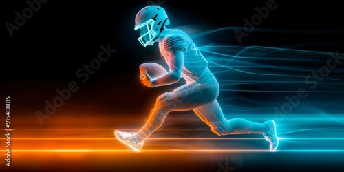 © AI Studio, Fototapeta premium Neon Blue and Orange American Football Player Running with Ball