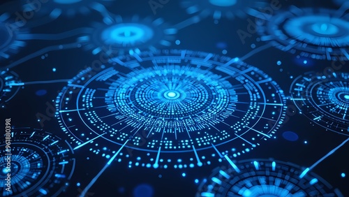 Obraz premium Neon Blue Circular Patterns with Scattered Particles