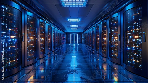 Naklejka premium Neon Blue Lights in Modern Data Center Aisle