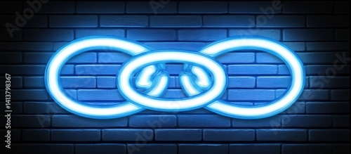 © Aziz, Obraz premium Neon blue linked circles on brick wall