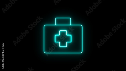 Obraz premium Neon blue medical kit with cross symbol on black background