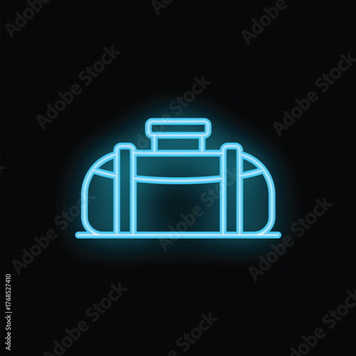 Obraz premium Neon blue travel bag icon is glowing against a black background