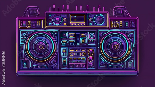© NatthaphonSiri, Obraz premium Neon Boombox 80s Retro Music Player Illustration.