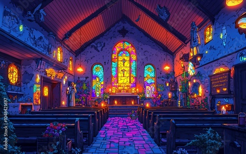 Obraz premium Neon Church Interior with Stained Glass Windows