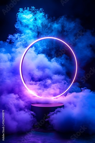 © gelas, Obraz premium Neon Circle on Podium, Smoky Background