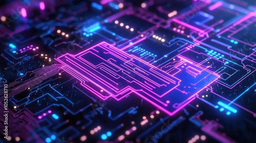 Obraz premium Neon Circuit Board Closeup - Glowing Lines and Connections, Futuristic...