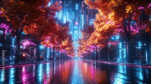 © akun, Naklejka premium Neon City Autumn Street, Night