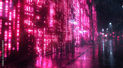 Fototapeta premium Neon city rain, digital wall, wet street, night