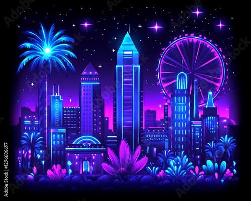 © Febi, Fototapeta premium Neon city skyline at night illustration for background