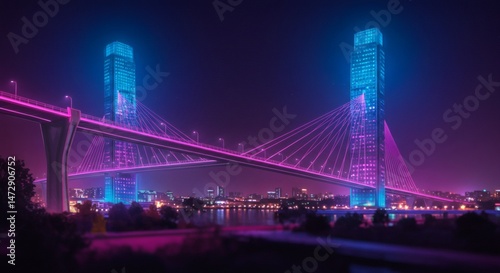 Naklejka premium Neon city skyline bridge at night with cyber punk futuristic architecture and river view landscape scene