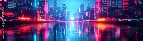 Obraz premium Neon city skyline reflecting in water.