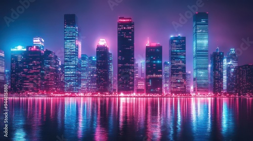 © BOJOShop, Fototapeta premium Neon City Skyline Reflection in Water