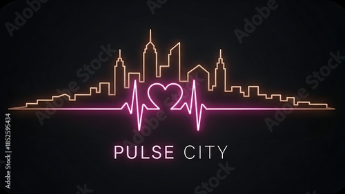© Alex, Obraz premium Neon city skyline with heart rhythm.