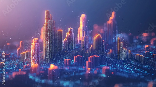 © Khomkit, Obraz premium Neon city skyline with illuminated skyscrapers and digital code reflected in the architectural design, showcasing a futuristic urban landscape at night.