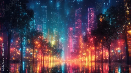 © Budi, Obraz premium Neon city street at night, futuristic cityscape, trees, rain, vibrant lights, background