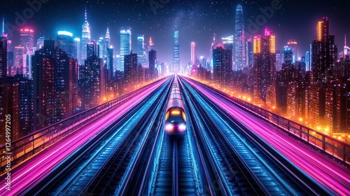 © Lemdah, Fototapeta premium Neon City Train Night Speed Future Travel