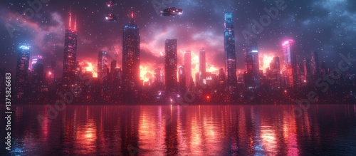 © Mega, Fototapeta premium Neon Cityscape at Dusk with Fiery Skies