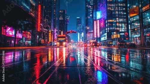 © abdul kahfi, Fototapeta premium Neon Cityscape at Night: Rain-slicked Streets Reflecting Vibrant Lights