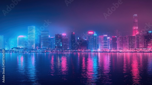 © slamet, Fototapeta premium Neon Cityscape at Night: Vibrant Hong Kong Skyline Reflected in Calm Waters