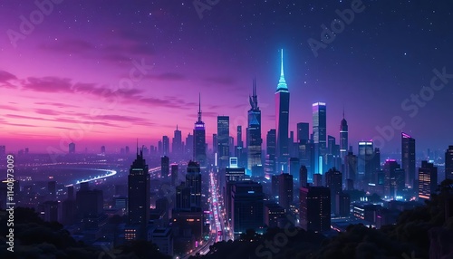© Asepdwi, Fototapeta premium Neon Cityscape at Twilight: A Dreamy, Synthwave Panorama
