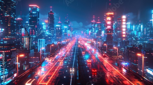 Fototapeta premium Neon Cityscape: Futuristic Highway Under a Rainy Night