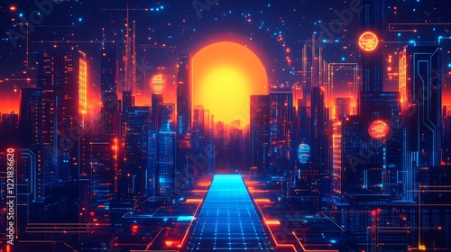Obraz premium Neon Cityscape Glows Vividly Under a Burning Orange Sunset. AI Generated