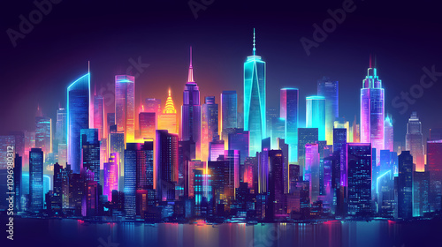 © Thiago, Fototapeta premium Neon cityscape night aerial view. Vivid Urban Jungle. Illustration