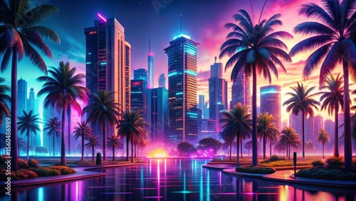 Obraz premium Neon Cityscape Park with Palm Trees at Sunset