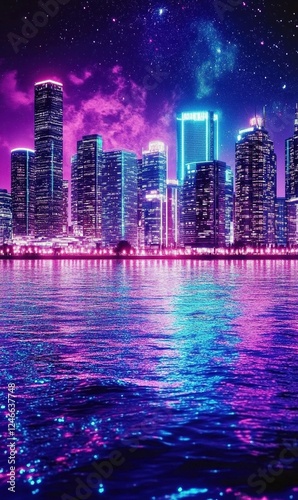 © Resni AI, Fototapeta premium Neon cityscape reflected in water at night