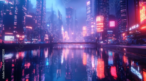 © studio_, Fototapeta premium Neon Cityscape Reflection