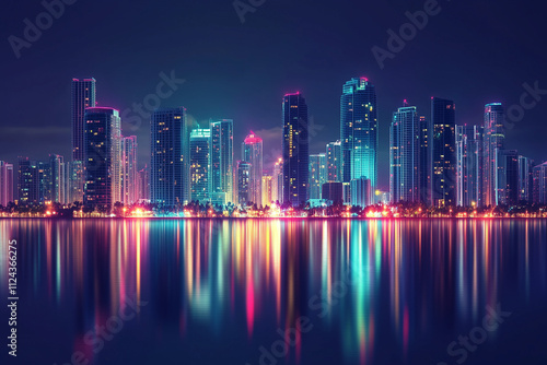 Fototapeta premium Neon Cityscape Reflection: Vibrant Night View with Skyscrapers and Water