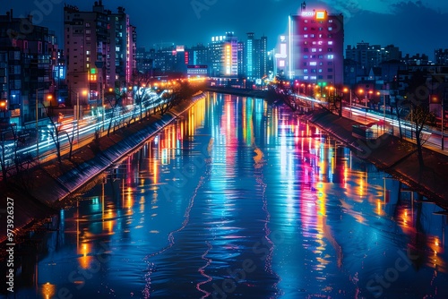 © AgungRikhi, Fototapeta premium Neon Cityscape Reflections