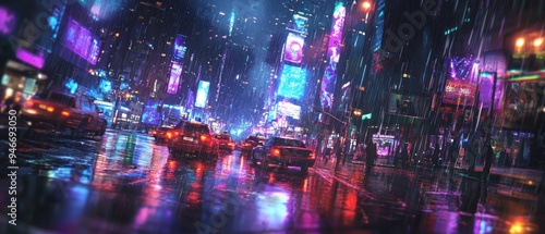© raja, Fototapeta premium Neon Cityscape Under Rain