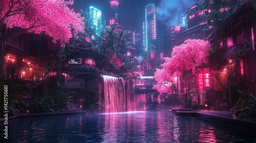 Obraz premium Neon Cityscape Waterfall Serenity: A Futuristic Asian Oasis